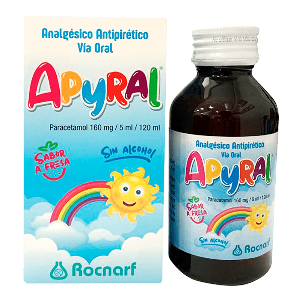 Principio Activo: Paracetamol (Acetaminofén) 160 mg / 5 ml.rnrnPresentación: Frasco de 120 ml con vaso o jeringa dosificadora.rnrnAcción Principal: Analgésico (dolor) y Antipirético (fiebre).rnrnIndicaciones: Fiebre, dolor de cabeza, malestar post-vacuna y síntomas de resfriado común en niños.rnrnVentajas: Sabor amigable, libre de aspirina (no irrita el estómago) y frasco de tamaño rendidor.