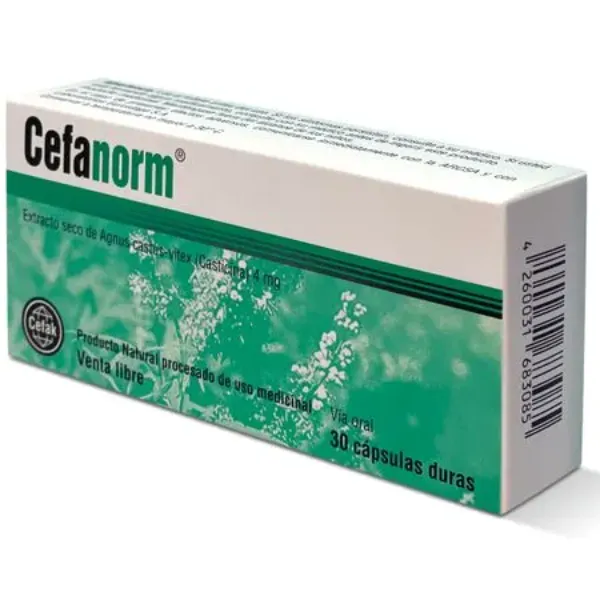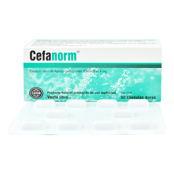 Principio Activo: Extracto seco de fruto de Vitex agnus-castus (4 mg).rnrnPresentación: Cápsula (Venta individual/suelta).rnrnAcción Principal: Regulador hormonal no sintético (Dopaminérgico natural).rnrnIndicaciones: Síndrome premenstrual (SPM), mastodinia (dolor de senos) e irregularidades en la frecuencia del ciclo menstrual.rnrnVentajas: Tratamiento de origen vegetal con excelente perfil de seguridad para uso prolongado.