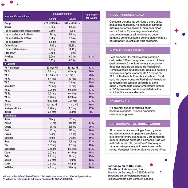 Producto: Alimento para propósitos médicos especiales.rnrnSabor: Vainilla (Aceptación garantizada).rnrnContenido neto: 850 gramos (Lata).rnrnComponentes Clave: Proteína de alta calidad, DHA, Omega 3, Prebióticos y Probióticos.rnrnBeneficios: Apoya el sistema inmune.rnrnFavorece el desarrollo cerebral y óseo.rnrnIdeal para niños con brechas nutricionales o crecimiento lento.rnrnCaracterísticas: Libre de lactosa y gluten (consulte etiqueta).
